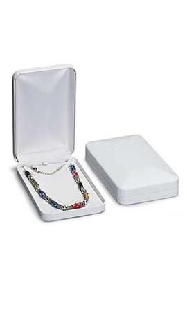 Mostrar hermosos collares en estas elegantes cajas negras imitación piel blanca con fondo de tela suave blanca.