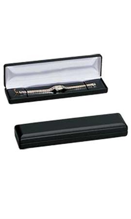 Mostrar hermosos brazaletes, plumas o relojes en estas elegantes cajas con imitación piel negra con fondo de tela suave blanca.