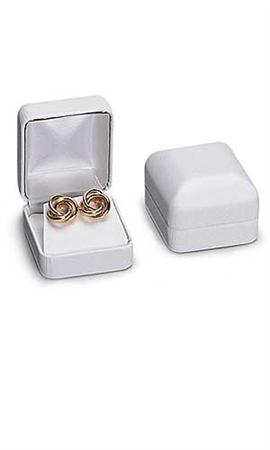 Mostrar hermosos aretes en estas elegantes cajas negras imitación piel blanca con fondo de tela suave blanca.