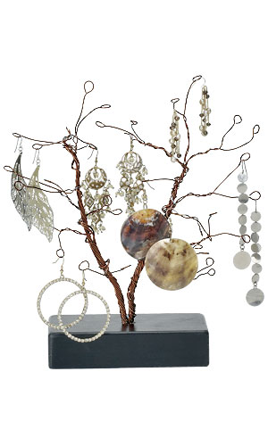 Este exhibidor en forma de arbol tiene un toque de arte manual y hace lucir muy bien sus joyas y transformar su sala de exhibición en una atracción! Este singular árbol de alambre está hecho para mantener todos sus pendientes o aretes colgantes para una presentación de 360 __grados . El hermoso arreglo mejora el glamour de los areteszs, ya que, naturalmente, cuelgan de las ramas como si fuera una fruta. Las ramas son flexibles y se pueden ajustar a su gusto y se sienta alrededor de 10 ½ "de alto con una sólida base de madera negro