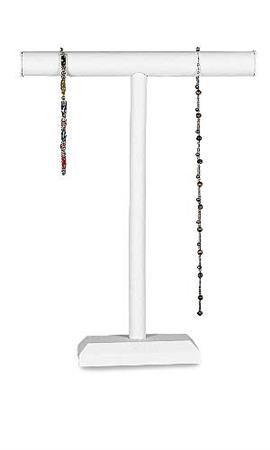 En este exhibidor en forma de T usted puede mostras collares / pulseras y otras joyas. Un nivel proporciona una fácil visualización de la mercancía sobre un fondo de imitacion piel.