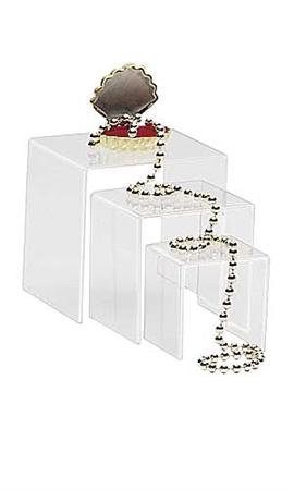 Estas plataformas de acrílico son muy utilies mostrar joyería, cosméticos, productos en caja, accesorios, regalos o prácticamente cualquier elemento menor. Estas plataformas vienen en juego de 3 piezas.