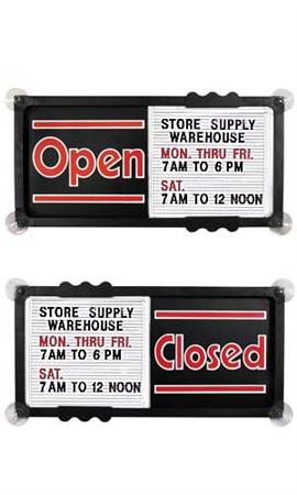 Tablero para señalar abieto/cerrado. Simplemente humedezca las ventosas adjuntas y se adhieren a la parte interior de su puerta o ventana de vidrio. Grupo se desliza hacia atrás y hacia adelante para decirle a sus clientes si están abiertas o cerradas. Además, hay espacio para una lista de sus horas de operación u otros mensajes. 360 letras, números, signos de puntuación y símbolos están incluidos.