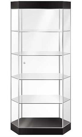 Vitrina de torre hexagonal extendida con luz con marcos de aluminio anodizado,vidrios templados, cuatro entrepaños de vidrio que se ajustan a la altura fácilmente, una de las puertas sin marco con cerradura y llaves.